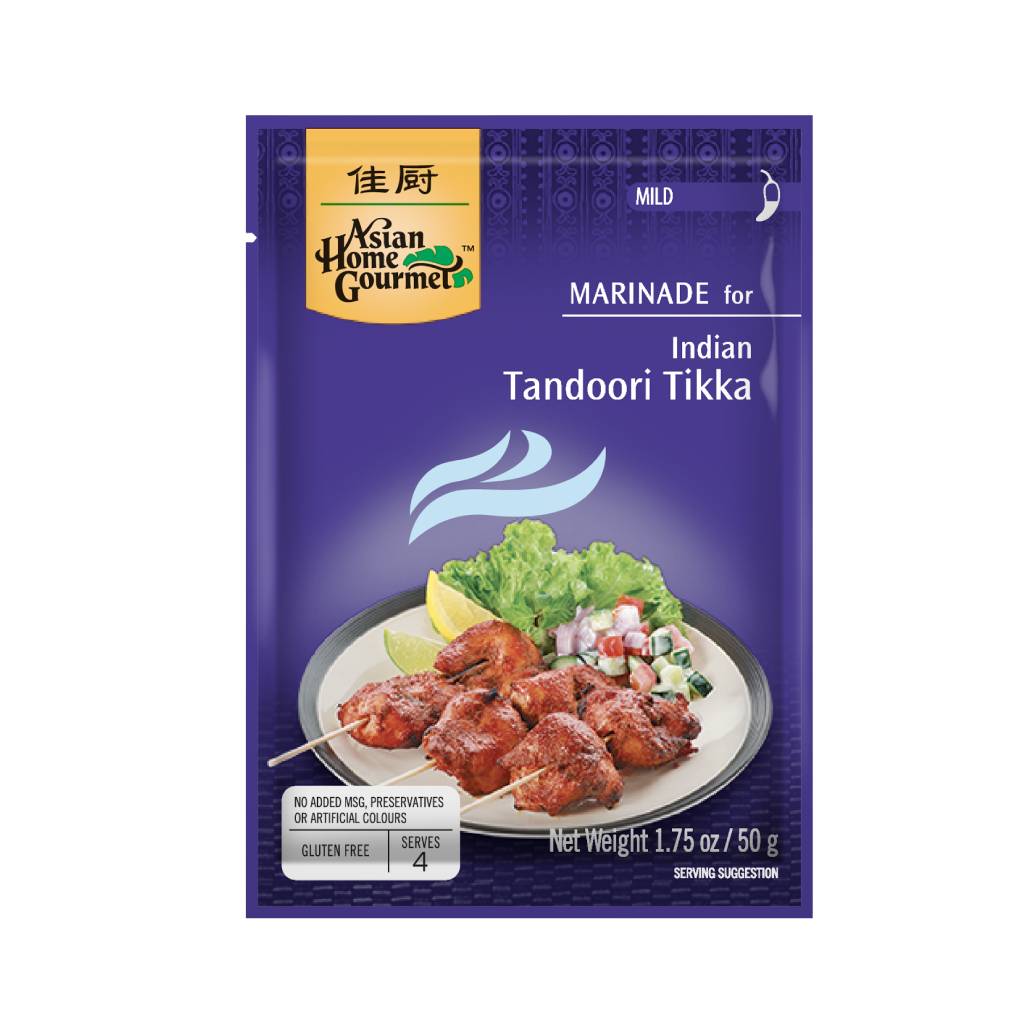Asian Home Gourmet’s Indian Tandoori Tikka helps you recreate a classic Northern Indian entr?e of mildly-spiced meats- this paste is best cooked with a grill or oven that will help infuse all the herbs and spices in this paste.Asian Home Gourmet pastes and mixes contain no flavor enhancers, preservatives or artificial colors. Available in 50g sachets.