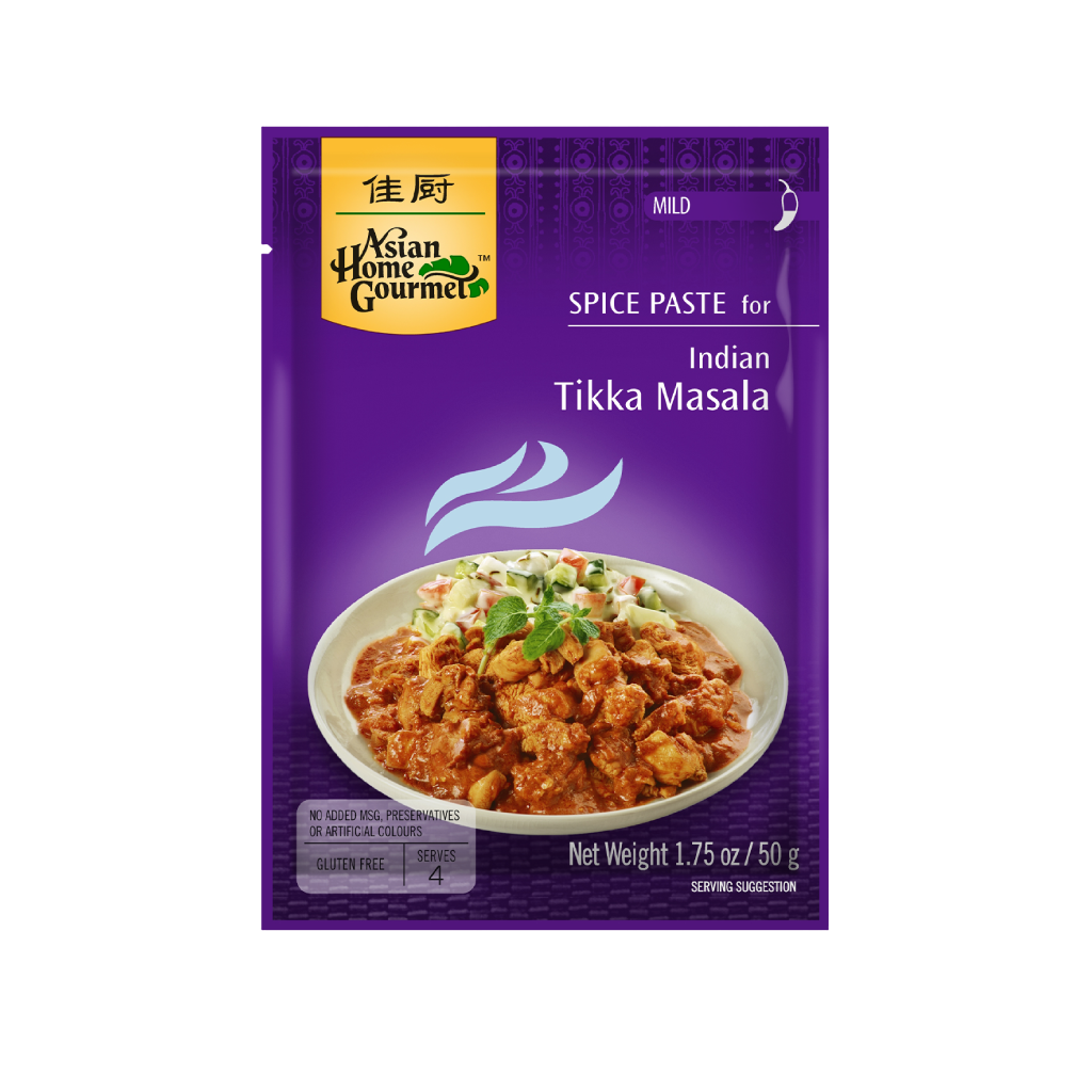 Asian Home Gourmet Indian Tikka Masala Paste with its perfectly balanced spicy but mild herb and spice mix of tomato, ginger, cloves, and turmeric has an authentic Indian taste. Serve with Basmati rice or naan. Asian Home Gourmet pastes and mixes contain no flavor enhancers, preservatives or artificial colors. Available in 50g sachets.